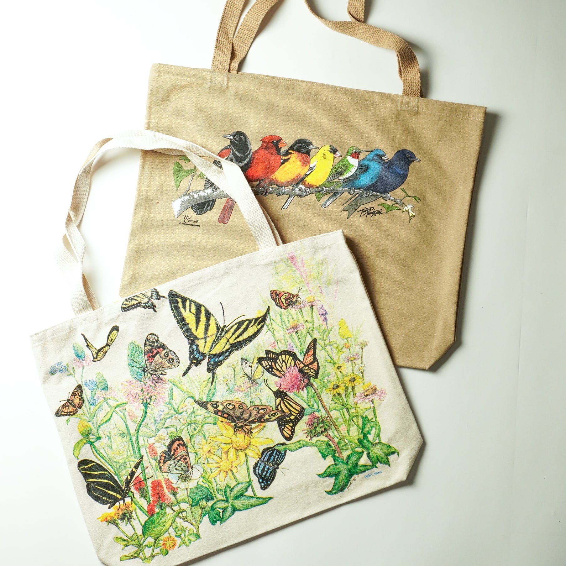 Wild Cottonのアメリカ製のキャンバストートバッグに、 Janet Suggsが描き下ろした、色とりどりな蝶々が蜜を求めて、さまざまな花に集まる庭園を表現した作品です。